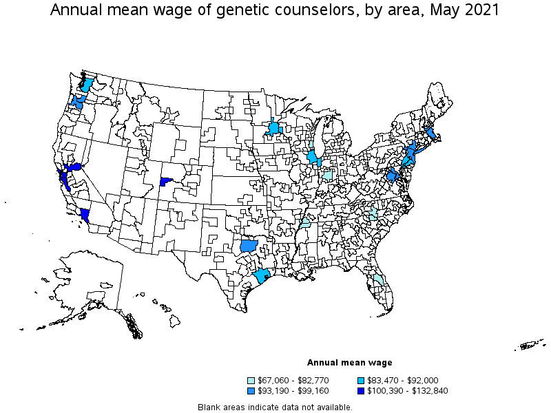 States and areas with the highest published employment, location quotients, and wages for Genetic Counselors are provided. For a list of all areas with employment in Genetic Counselors, see the Create Customized Tables function.