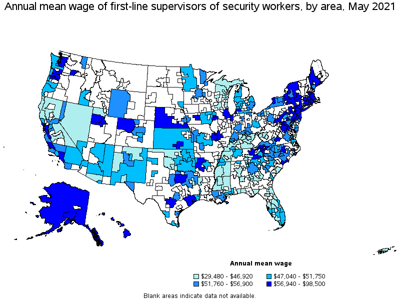 States and areas with the highest published employment, location quotients, and wages for First-Line Supervisors of Security Workers are provided. For a list of all areas with employment in First-Line Supervisors of Security Workers, see the Create Customized Tables function.
