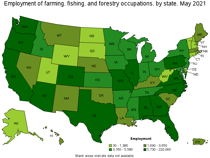 States and areas with the highest published employment, location quotients, and wages for Farming, Fishing, and Forestry Occupations are provided. For a list of all areas with employment in Farming, Fishing, and Forestry Occupations, see the Create Customized Tables function.