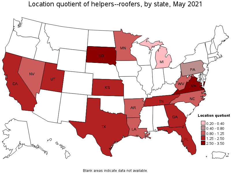 States with the highest concentration of jobs and location quotients in Helpers--Roofers: