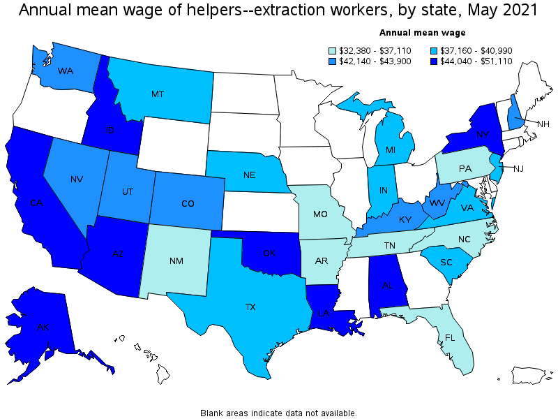 States and areas with the highest published employment, location quotients, and wages for Helpers--Extraction Workers are provided. For a list of all areas with employment in Helpers--Extraction Workers, see the Create Customized Tables function.