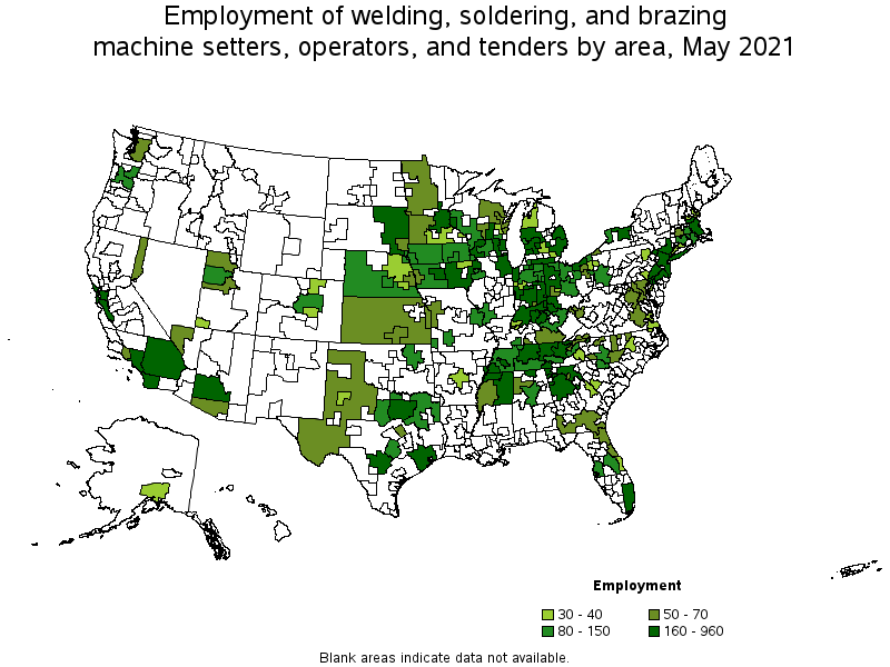States and areas with the highest published employment, location quotients, and wages for Welding, Soldering, and Brazing Machine Setters, Operators, and Tenders are provided. For a list of all areas with employment in Welding, Soldering, and Brazing Machine Setters, Operators, and Tenders, see the Create Customized Tables function.