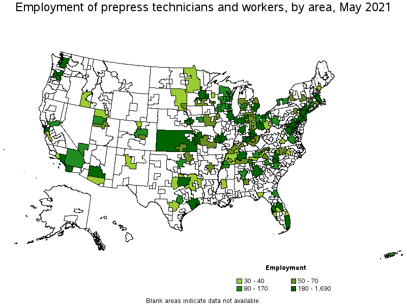Metropolitan areas with the highest concentration of jobs and location quotients in Prepress Technicians and Workers: