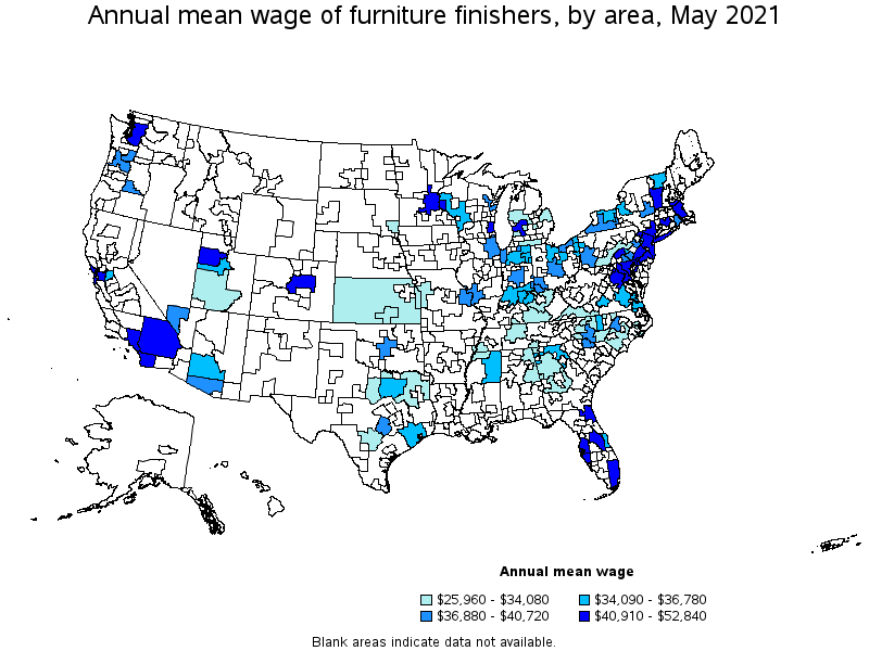 States and areas with the highest published employment, location quotients, and wages for Furniture Finishers are provided. For a list of all areas with employment in Furniture Finishers, see the Create Customized Tables function.