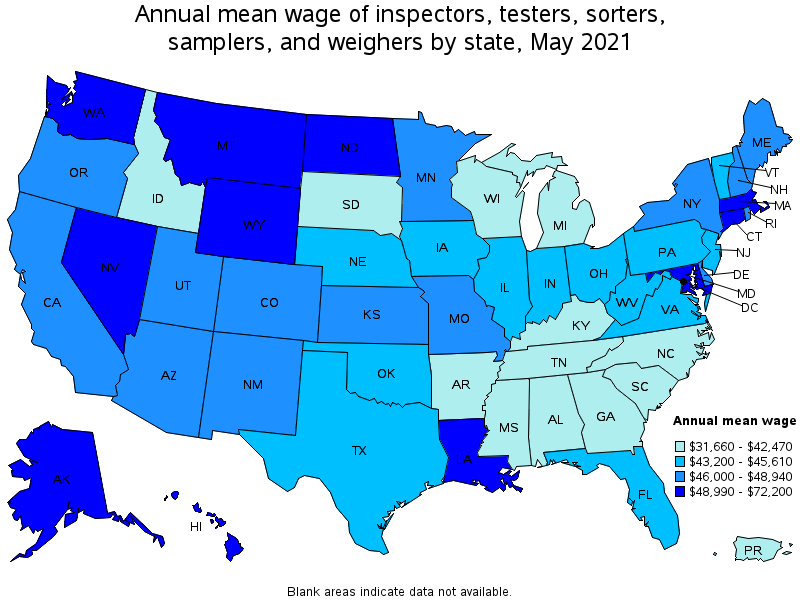 States and areas with the highest published employment, location quotients, and wages for Inspectors, Testers, Sorters, Samplers, and Weighers are provided. For a list of all areas with employment in Inspectors, Testers, Sorters, Samplers, and Weighers, see the Create Customized Tables function.