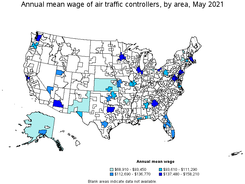 States and areas with the highest published employment, location quotients, and wages for Air Traffic Controllers are provided. For a list of all areas with employment in Air Traffic Controllers, see the Create Customized Tables function.