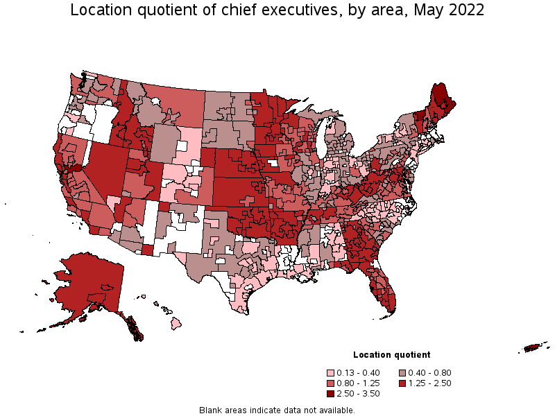 States with the highest concentration of jobs and location quotients in Chief Executives: