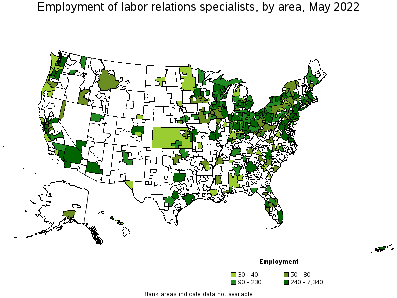 States and areas with the highest published employment, location quotients, and wages for Labor Relations Specialists are provided. For a list of all areas with employment in Labor Relations Specialists, see the Create Customized Tables function.