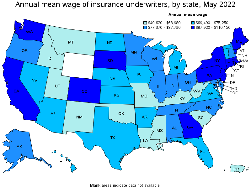 States and areas with the highest published employment, location quotients, and wages for Insurance Underwriters are provided. For a list of all areas with employment in Insurance Underwriters, see the Create Customized Tables function.