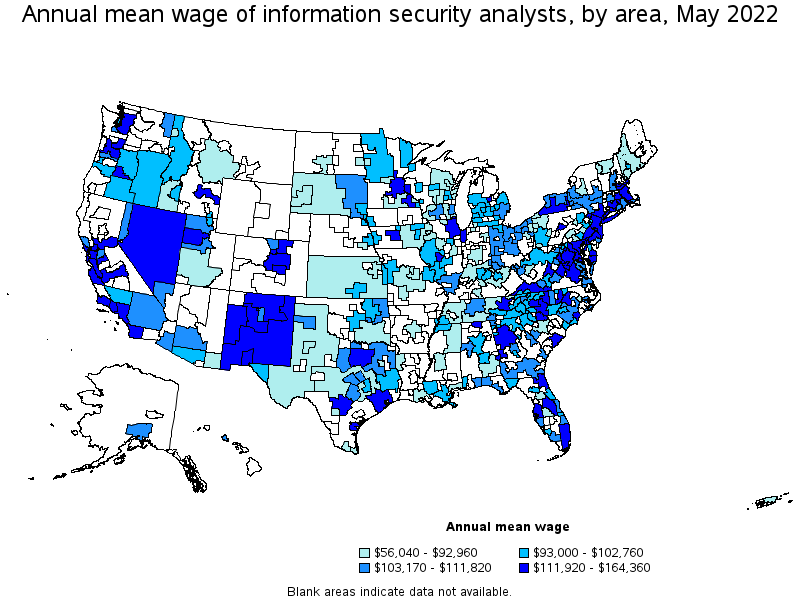 States and areas with the highest published employment, location quotients, and wages for Information Security Analysts are provided. For a list of all areas with employment in Information Security Analysts, see the Create Customized Tables function.