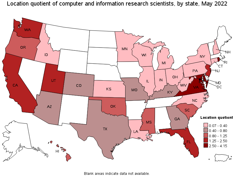 States with the highest concentration of jobs and location quotients in Computer and Information Research Scientists: