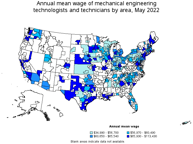States and areas with the highest published employment, location quotients, and wages for Mechanical Engineering Technologists and Technicians are provided. For a list of all areas with employment in Mechanical Engineering Technologists and Technicians, see the Create Customized Tables function.