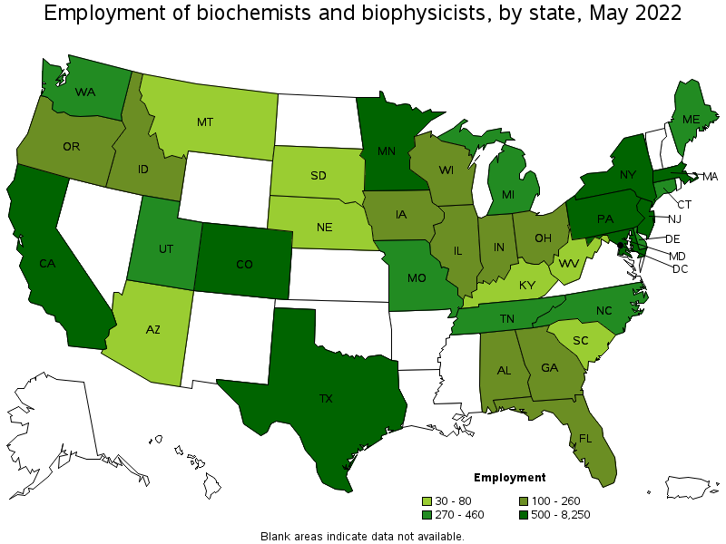 States and areas with the highest published employment, location quotients, and wages for Biochemists and Biophysicists are provided. For a list of all areas with employment in Biochemists and Biophysicists, see the Create Customized Tables function.