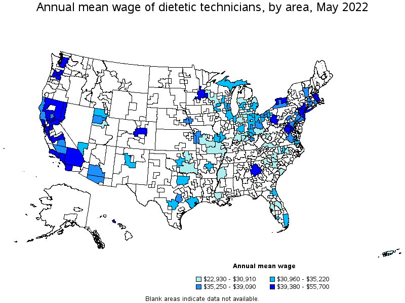 States and areas with the highest published employment, location quotients, and wages for Dietetic Technicians are provided. For a list of all areas with employment in Dietetic Technicians, see the Create Customized Tables function.