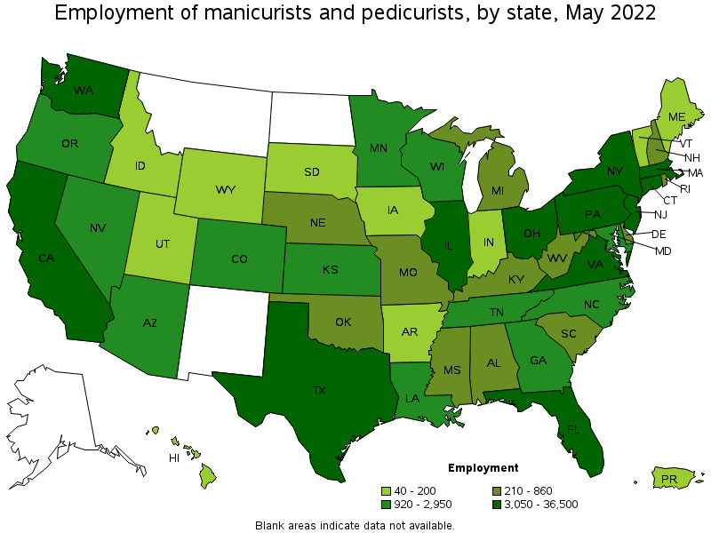 States and areas with the highest published employment, location quotients, and wages for Manicurists and Pedicurists are provided. For a list of all areas with employment in Manicurists and Pedicurists, see the Create Customized Tables function.