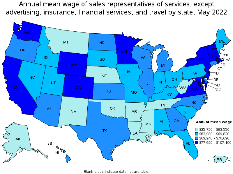 States and areas with the highest published employment, location quotients, and wages for Sales Representatives of Services, Except Advertising, Insurance, Financial Services, and Travel are provided. For a list of all areas with employment in Sales Representatives of Services, Except Advertising, Insurance, Financial Services, and Travel, see the Create Customized Tables function.