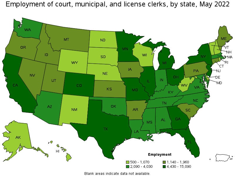 States and areas with the highest published employment, location quotients, and wages for Court, Municipal, and License Clerks are provided. For a list of all areas with employment in Court, Municipal, and License Clerks, see the Create Customized Tables function.