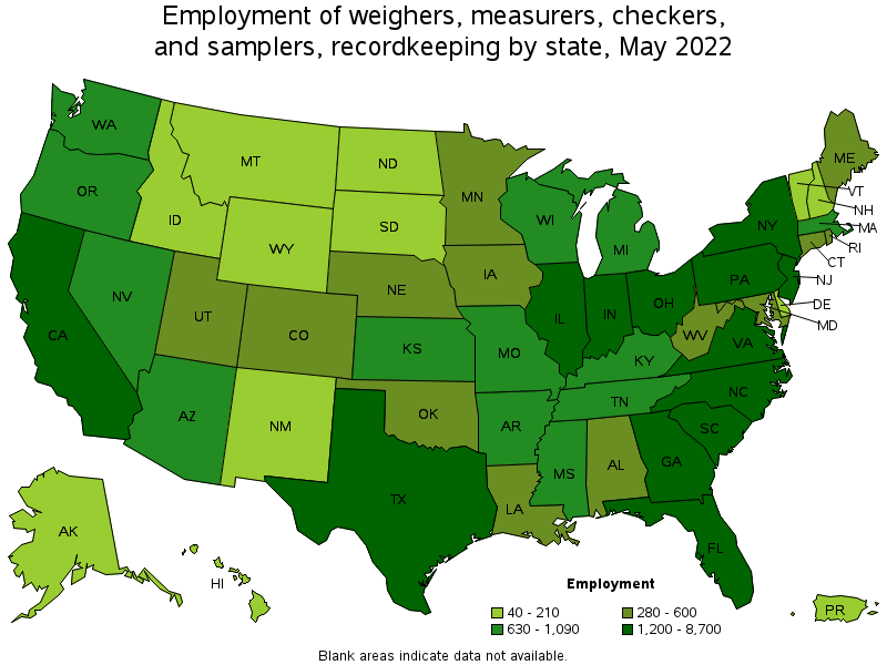States and areas with the highest published employment, location quotients, and wages for Weighers, Measurers, Checkers, and Samplers, Recordkeeping are provided. For a list of all areas with employment in Weighers, Measurers, Checkers, and Samplers, Recordkeeping, see the Create Customized Tables function.