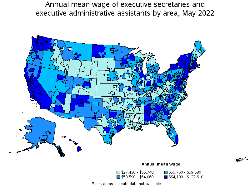 States and areas with the highest published employment, location quotients, and wages for Executive Secretaries and Executive Administrative Assistants are provided. For a list of all areas with employment in Executive Secretaries and Executive Administrative Assistants, see the Create Customized Tables function.