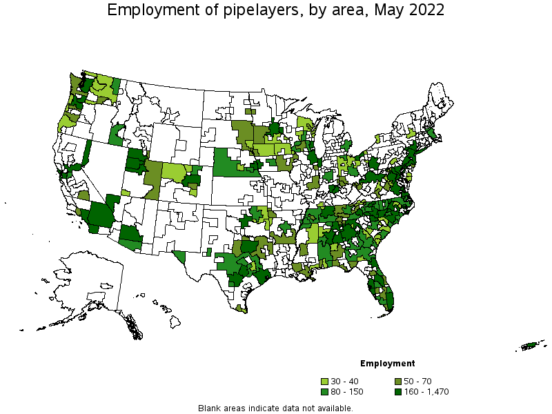 States and areas with the highest published employment, location quotients, and wages for Pipelayers are provided. For a list of all areas with employment in Pipelayers, see the Create Customized Tables function.