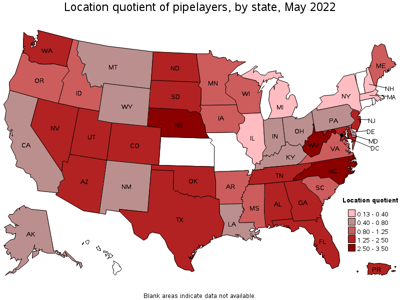 States with the highest concentration of jobs and location quotients in Pipelayers: