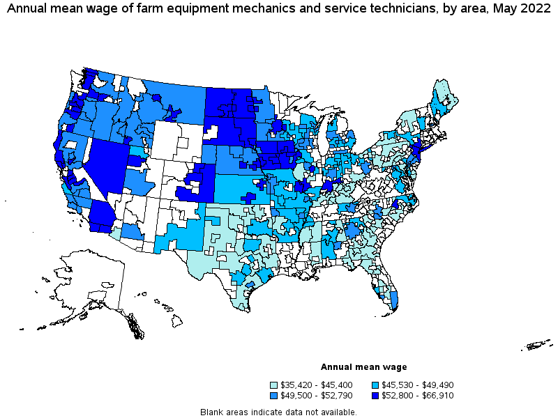 States and areas with the highest published employment, location quotients, and wages for Farm Equipment Mechanics and Service Technicians are provided. For a list of all areas with employment in Farm Equipment Mechanics and Service Technicians, see the Create Customized Tables function.