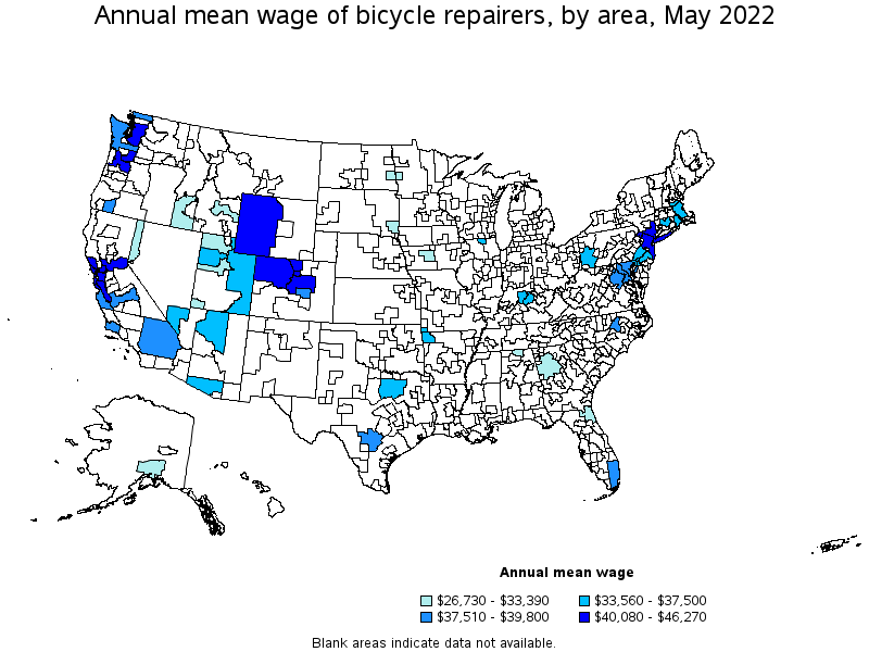 States and areas with the highest published employment, location quotients, and wages for Bicycle Repairers are provided. For a list of all areas with employment in Bicycle Repairers, see the Create Customized Tables function.