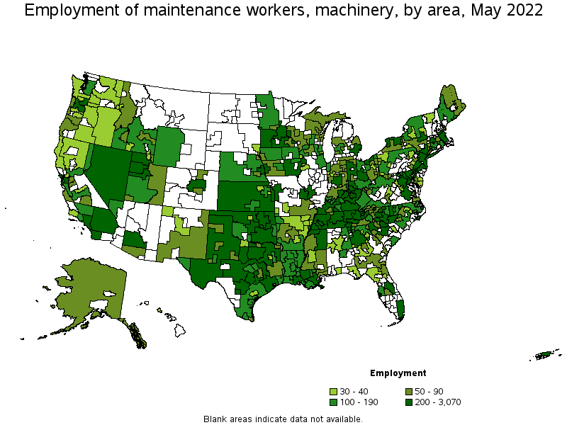 States and areas with the highest published employment, location quotients, and wages for Maintenance Workers, Machinery are provided. For a list of all areas with employment in Maintenance Workers, Machinery, see the Create Customized Tables function.