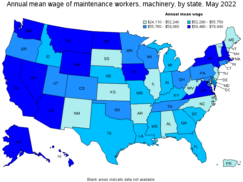 Map of annual mean wages of maintenance workers, machinery by state, May 2022