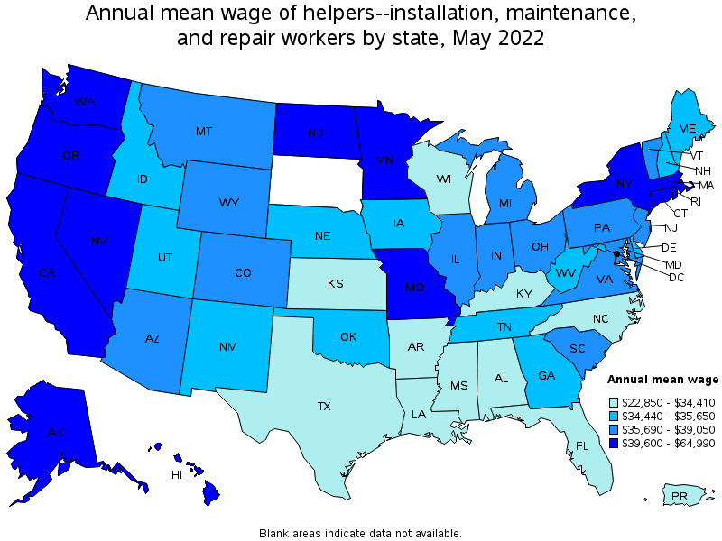 States and areas with the highest published employment, location quotients, and wages for Helpers--Installation, Maintenance, and Repair Workers are provided. For a list of all areas with employment in Helpers--Installation, Maintenance, and Repair Workers, see the Create Customized Tables function.