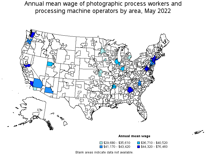 States and areas with the highest published employment, location quotients, and wages for Photographic Process Workers and Processing Machine Operators are provided. For a list of all areas with employment in Photographic Process Workers and Processing Machine Operators, see the Create Customized Tables function.