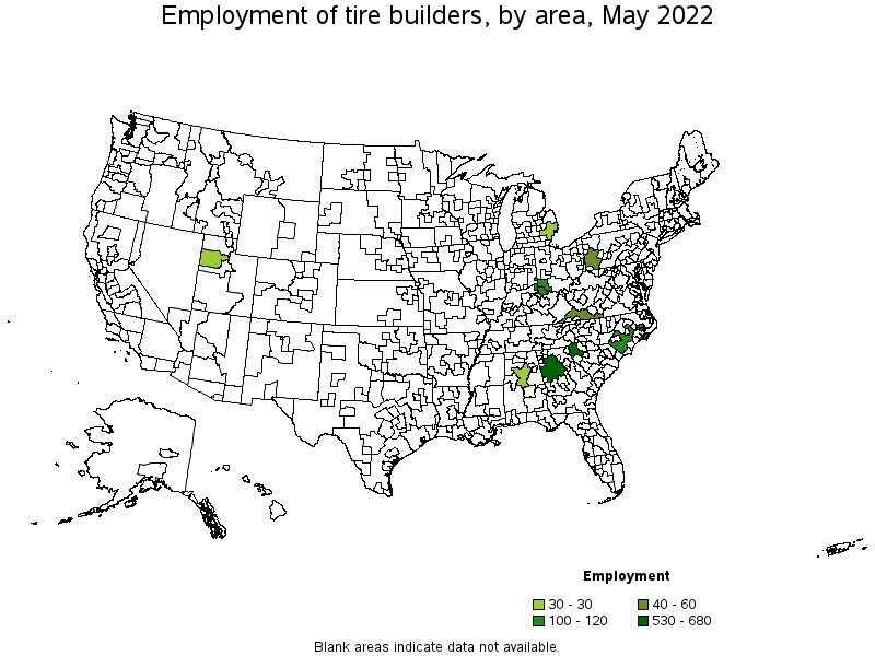 States and areas with the highest published employment, location quotients, and wages for Tire Builders are provided. For a list of all areas with employment in Tire Builders, see the Create Customized Tables function.