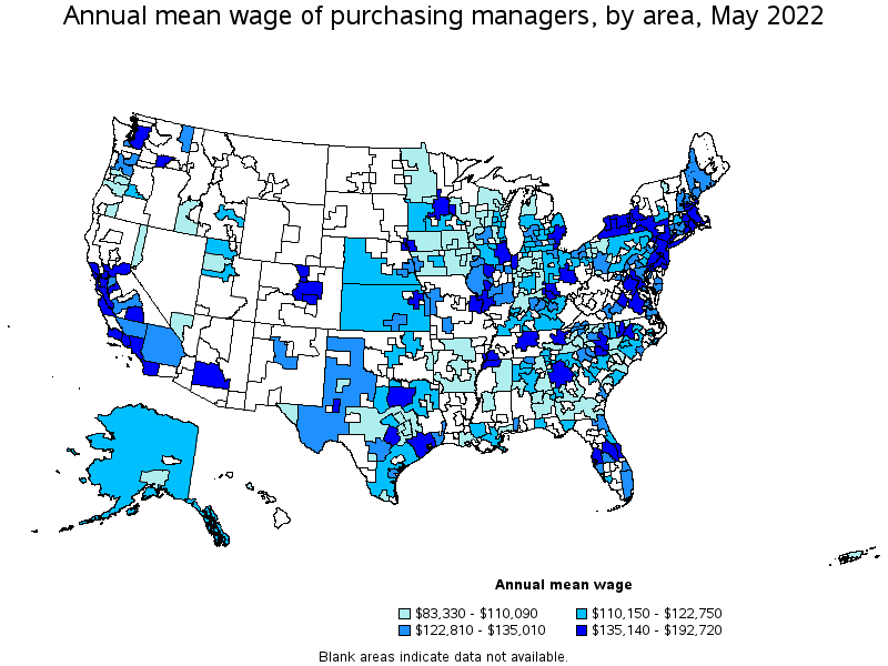 States and areas with the highest published employment, location quotients, and wages for Purchasing Managers are provided. For a list of all areas with employment in Purchasing Managers, see the Create Customized Tables function.