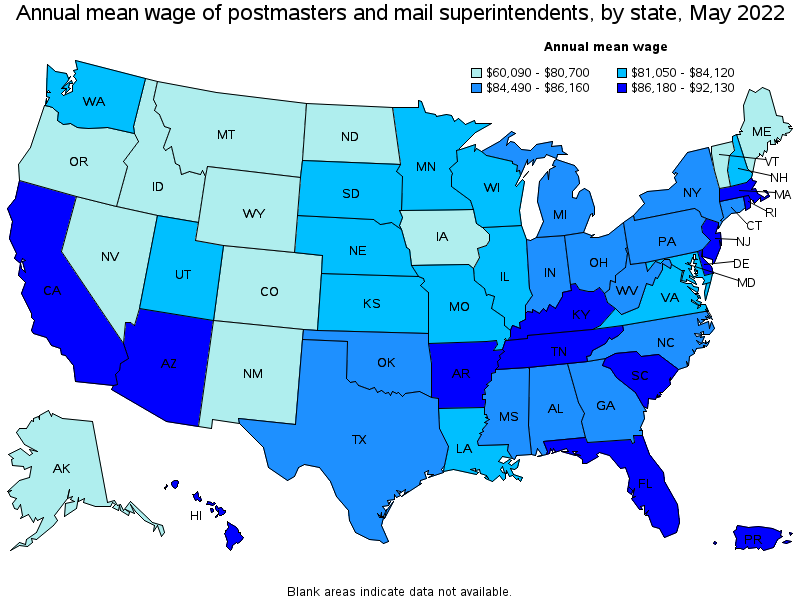 States and areas with the highest published employment, location quotients, and wages for Postmasters and Mail Superintendents are provided. For a list of all areas with employment in Postmasters and Mail Superintendents, see the Create Customized Tables function.