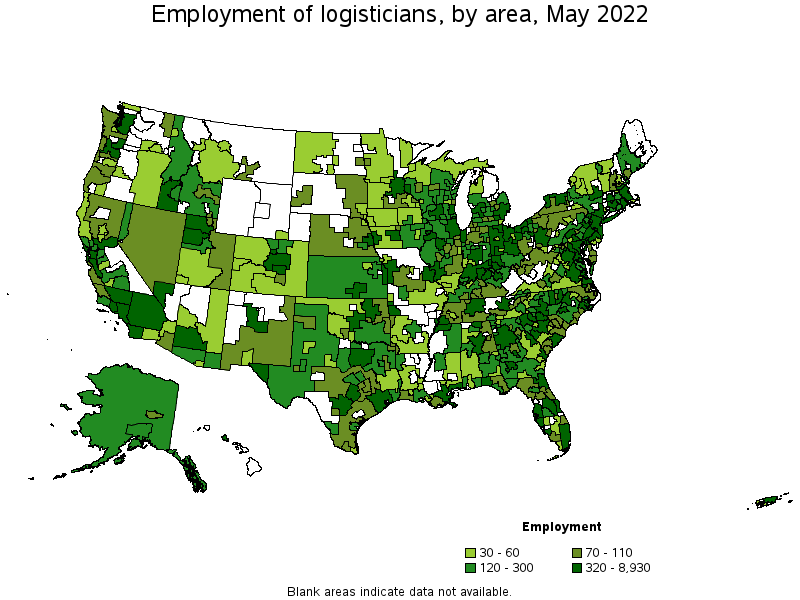 States and areas with the highest published employment, location quotients, and wages for Logisticians are provided. For a list of all areas with employment in Logisticians, see the Create Customized Tables function.