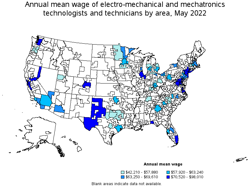 States and areas with the highest published employment, location quotients, and wages for Electro-Mechanical and Mechatronics Technologists and Technicians are provided. For a list of all areas with employment in Electro-Mechanical and Mechatronics Technologists and Technicians, see the Create Customized Tables function.