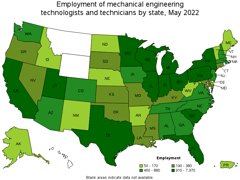States and areas with the highest published employment, location quotients, and wages for Mechanical Engineering Technologists and Technicians are provided. For a list of all areas with employment in Mechanical Engineering Technologists and Technicians, see the Create Customized Tables function.