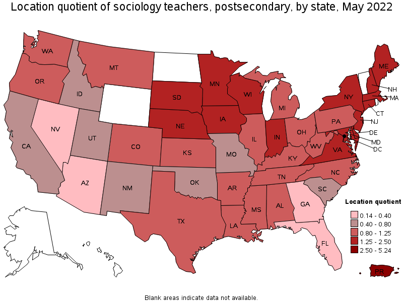 States and areas with the highest published employment, location quotients, and wages for Sociology Teachers, Postsecondary are provided. For a list of all areas with employment in Sociology Teachers, Postsecondary, see the Create Customized Tables function.