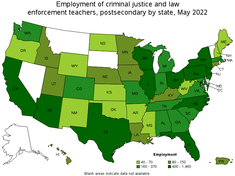 States and areas with the highest published employment, location quotients, and wages for Criminal Justice and Law Enforcement Teachers, Postsecondary are provided. For a list of all areas with employment in Criminal Justice and Law Enforcement Teachers, Postsecondary, see the Create Customized Tables function.