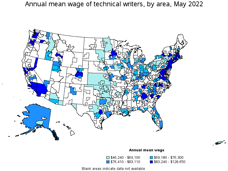 States and areas with the highest published employment, location quotients, and wages for Technical Writers are provided. For a list of all areas with employment in Technical Writers, see the Create Customized Tables function.