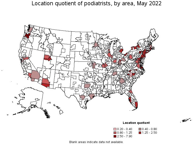 States and areas with the highest published employment, location quotients, and wages for Podiatrists are provided. For a list of all areas with employment in Podiatrists, see the Create Customized Tables function.