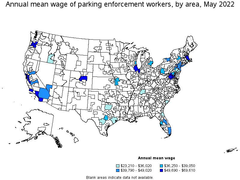 States and areas with the highest published employment, location quotients, and wages for Parking Enforcement Workers are provided. For a list of all areas with employment in Parking Enforcement Workers, see the Create Customized Tables function.