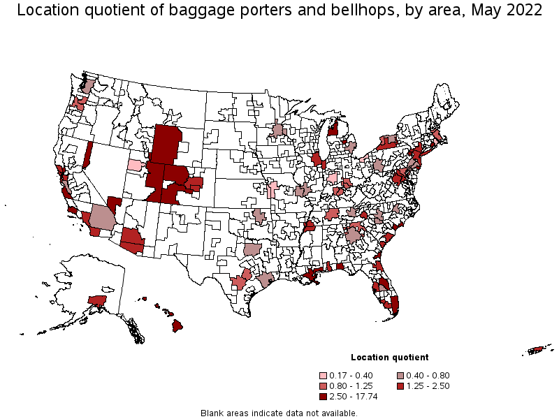 States and areas with the highest published employment, location quotients, and wages for Baggage Porters and Bellhops are provided. For a list of all areas with employment in Baggage Porters and Bellhops, see the Create Customized Tables function.