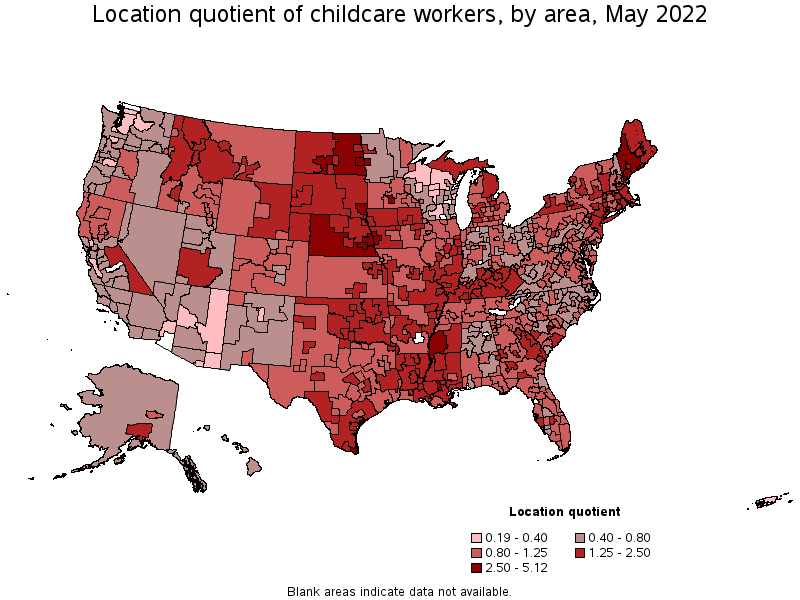 States and areas with the highest published employment, location quotients, and wages for Childcare Workers are provided. For a list of all areas with employment in Childcare Workers, see the Create Customized Tables function.