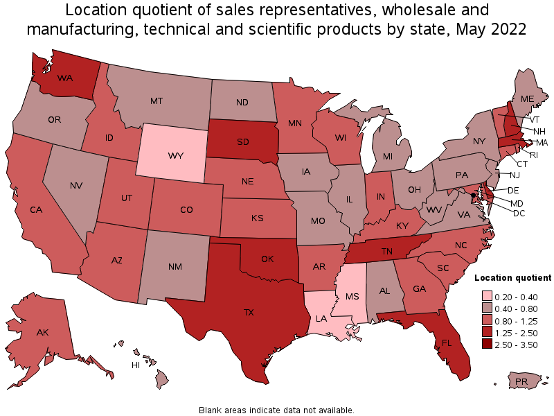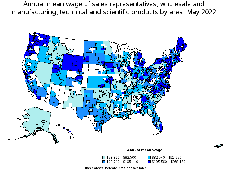 States and areas with the highest published employment, location quotients, and wages for Sales Representatives, Wholesale and Manufacturing, Technical and Scientific Products are provided. For a list of all areas with employment in Sales Representatives, Wholesale and Manufacturing, Technical and Scientific Products, see the Create Customized Tables function.