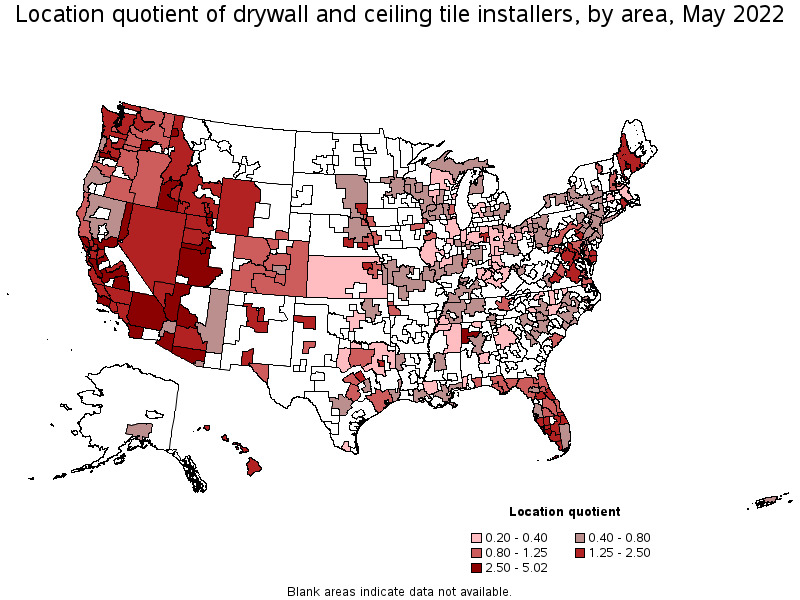 Map of location quotient of drywall and ceiling tile installers by area, May 2022