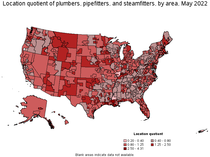 States and areas with the highest published employment, location quotients, and wages for Plumbers, Pipefitters, and Steamfitters are provided. For a list of all areas with employment in Plumbers, Pipefitters, and Steamfitters, see the Create Customized Tables function.
