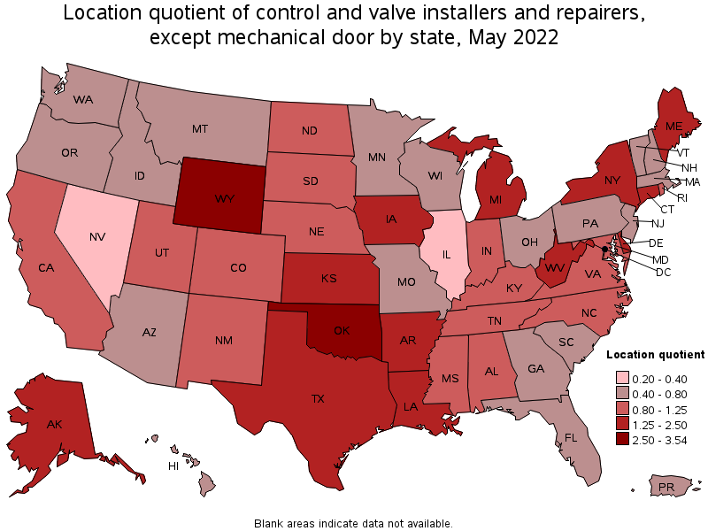 States with the highest concentration of jobs and location quotients in Control and Valve Installers and Repairers, Except Mechanical Door: