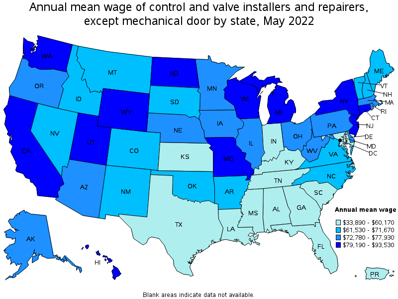 States and areas with the highest published employment, location quotients, and wages for Control and Valve Installers and Repairers, Except Mechanical Door are provided. For a list of all areas with employment in Control and Valve Installers and Repairers, Except Mechanical Door, see the Create Customized Tables function.