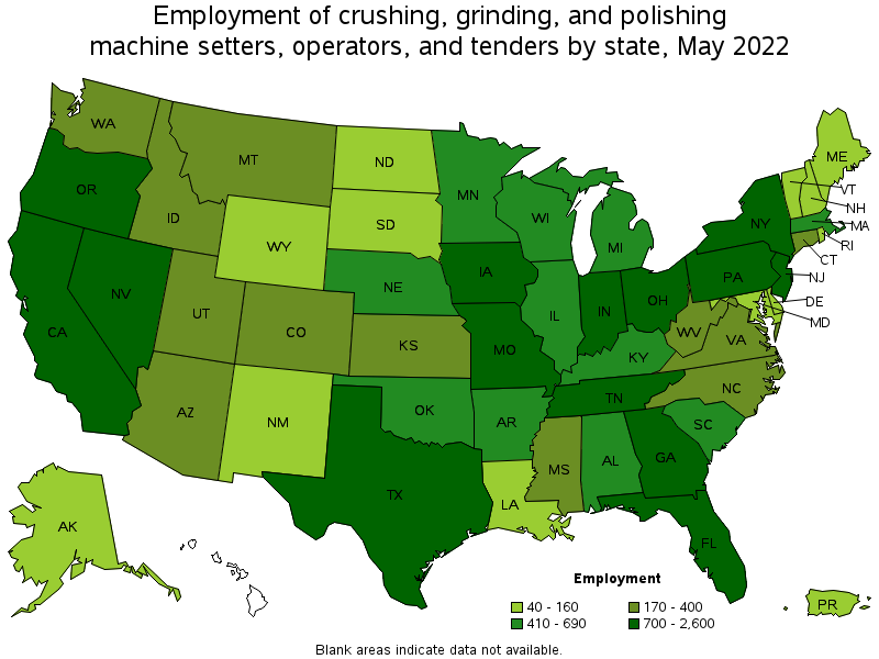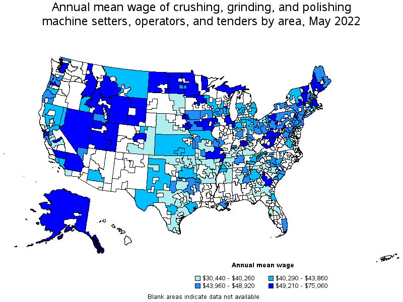 States and areas with the highest published employment, location quotients, and wages for Crushing, Grinding, and Polishing Machine Setters, Operators, and Tenders are provided. For a list of all areas with employment in Crushing, Grinding, and Polishing Machine Setters, Operators, and Tenders, see the Create Customized Tables function.